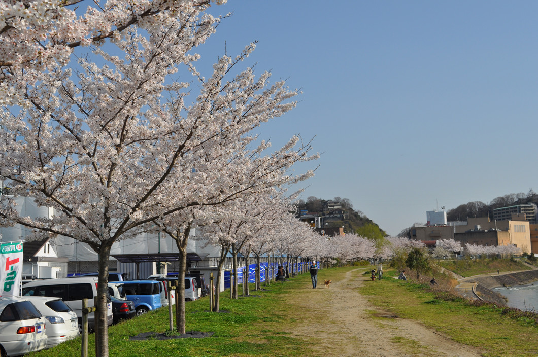 絹延橋駅から徒歩圏で楽しめるソメイヨシノの桜並木。ビッグハープを背景に見事な風景が続いています。