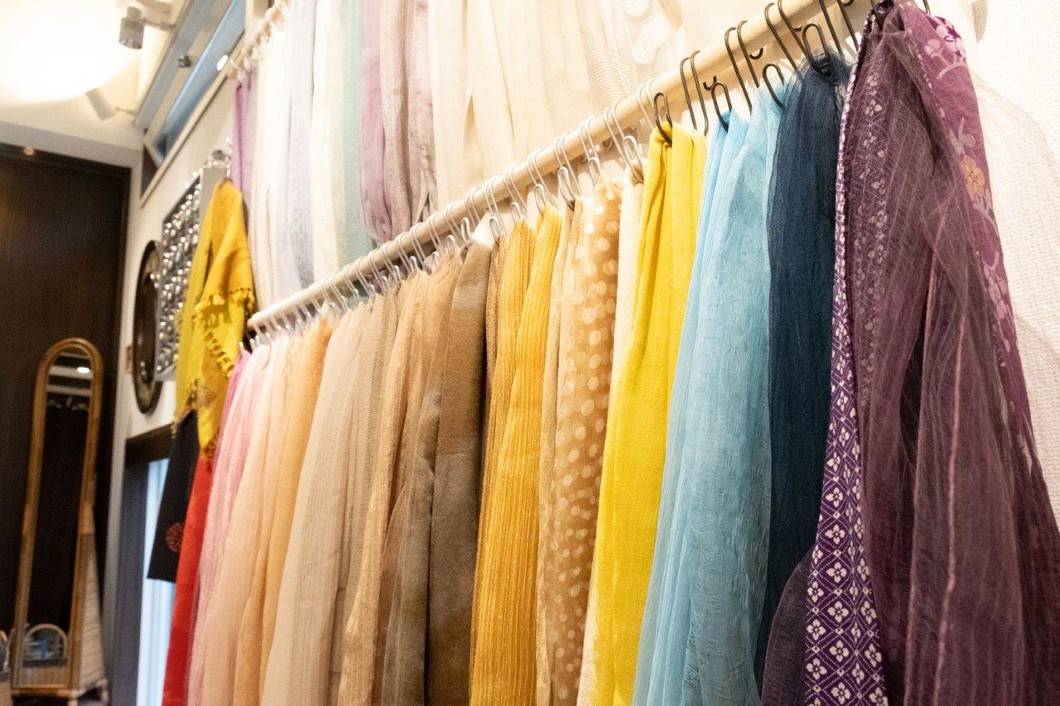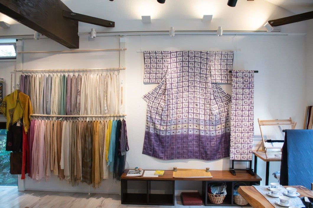 色鮮やかながら自然そのもののやさしさを纏う染め物に、心が癒される空間です。