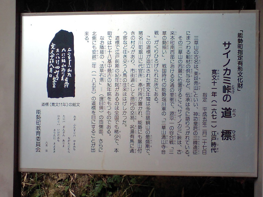 三草山への登り口がある才の神峠は、7本もの道が交叉する峠道で、能勢町最古の道標があります。その道標には「有馬」、「銀山」、「いけ田」などと標されており名湯、鉱山、酒造りへと通う人々の要衝の峠道であったといわれています。